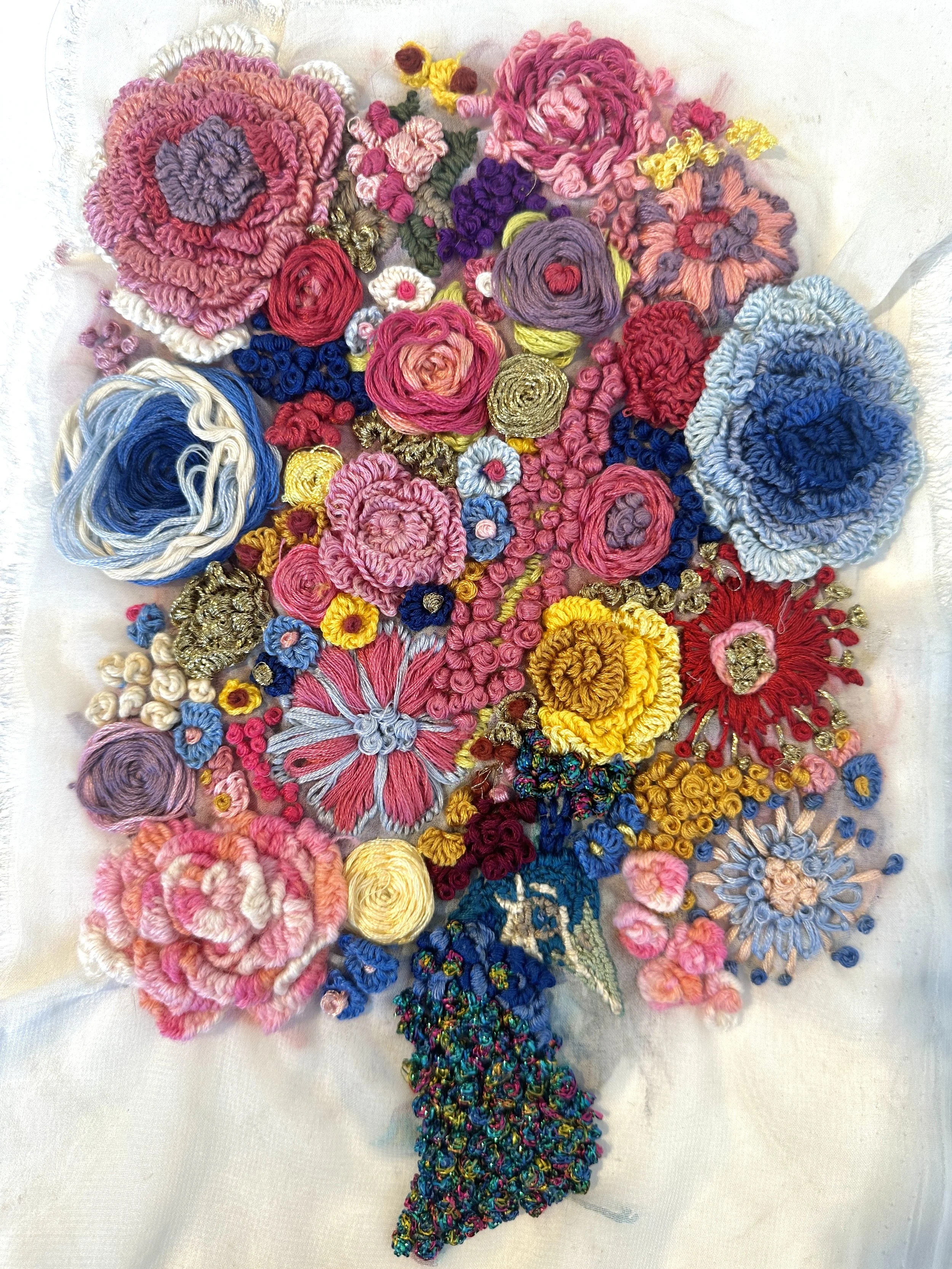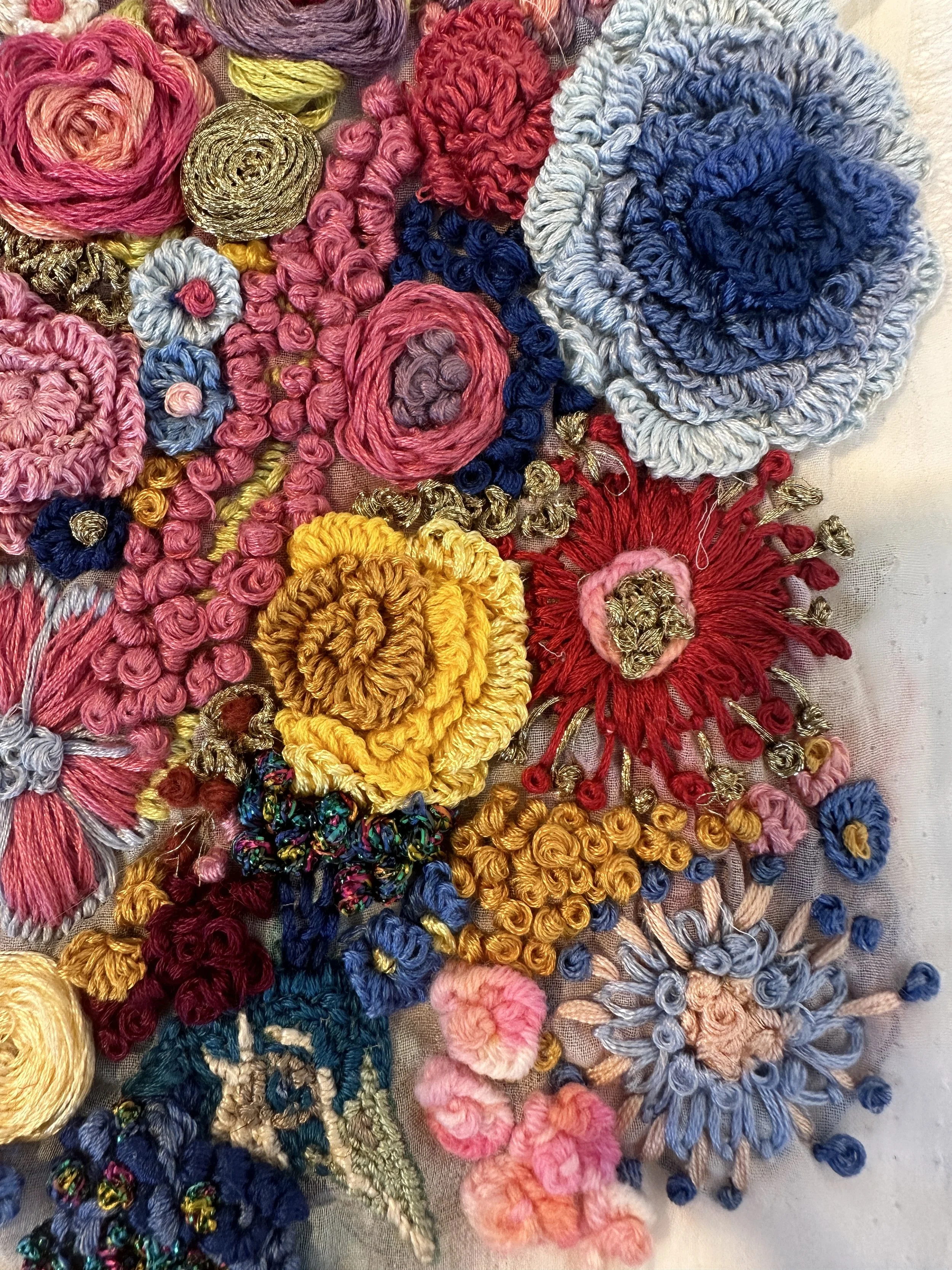 Flower hand embroidery using daisy stitch technique and French knots 16cm L, 16cm W